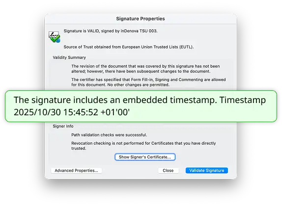 Adding a qualified time stamp to an electronic signature makes it possible to objectively and verifiably prove the exact moment when a document was signed. Time stamping provides an independent, secure, and legally valid time reference, especially in contractual disputes, documents with legal deadlines, and deferred or multi-signer signature processes.